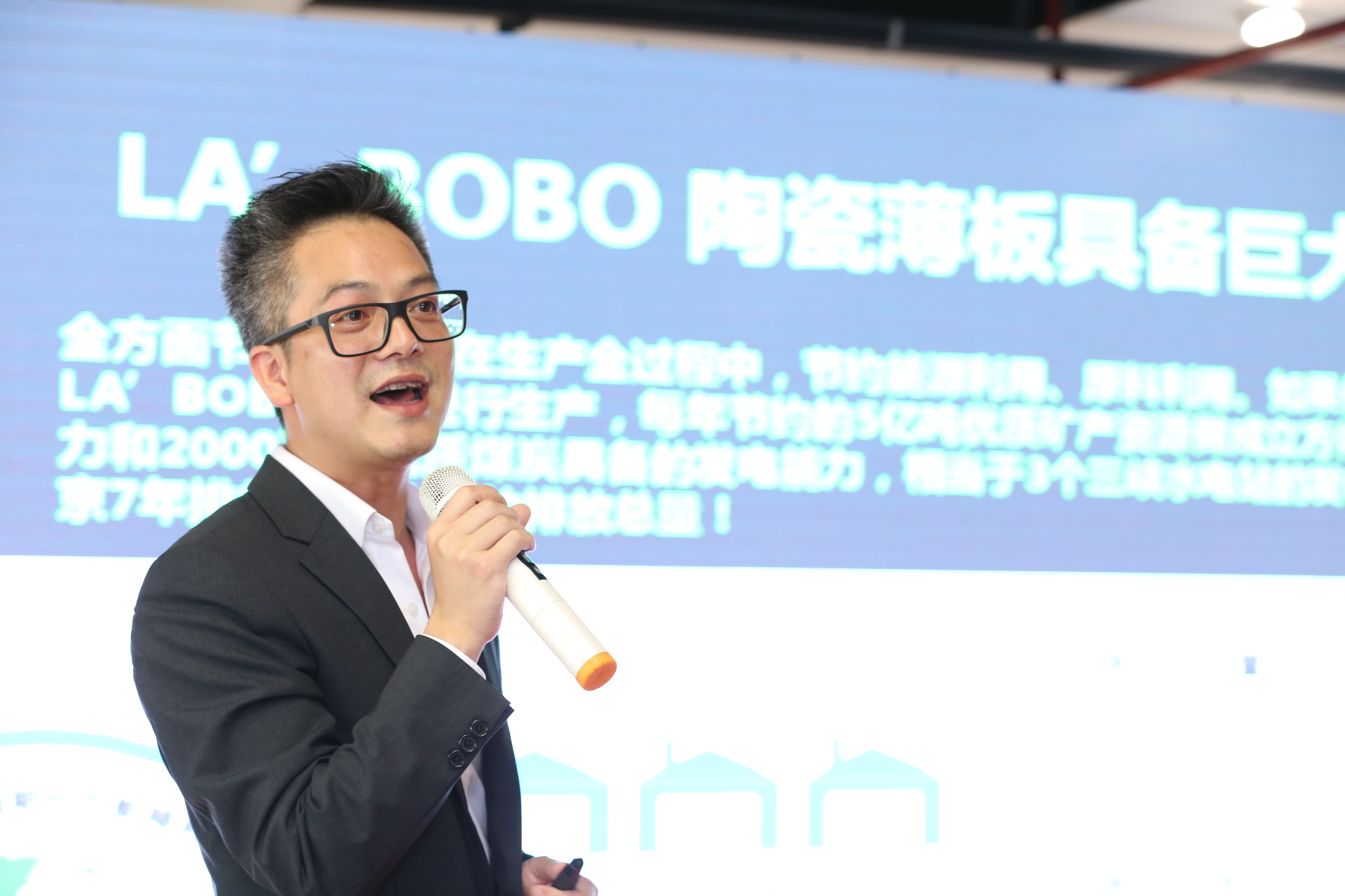 在發(fā)布會(huì)上,LA’BOBO陶瓷薄板董事長(zhǎng)唐碩度對(duì)LA’BOBO的創(chuàng)新之路進(jìn)行了全面的詮釋。LA’BOBO陶瓷薄板從2009年開(kāi)始專(zhuān)心、專(zhuān)注、專(zhuān)業(yè)研發(fā)只有4.8mm厚的陶瓷薄板,8年來(lái)從裝備研發(fā)、工藝開(kāi)發(fā)、產(chǎn)品設(shè)計(jì)、營(yíng)銷(xiāo)以及安裝應(yīng)用全方位的在不斷技術(shù)創(chuàng)新。并在國(guó)際市場(chǎng)及中國(guó)工裝市場(chǎng)取得了一定的成就,因?yàn)長(zhǎng)A’BOBO陶瓷薄板不僅具備巨大的社會(huì)價(jià)值,同時(shí),具備巨大的使用價(jià)值和商業(yè)價(jià)值。與傳統(tǒng)瓷磚相比,礦產(chǎn)資源節(jié)約63%以上、電力節(jié)約50%以上,燃料節(jié)約56%以上,減少二氧化硫和二氧化碳的排放60%以上;由于輕量化、薄型化等特征,在物流運(yùn)輸、垂直運(yùn)輸、安裝鋪貼環(huán)節(jié)能夠大量節(jié)省能源、耗材和輔材,所以在商業(yè)應(yīng)用中達(dá)到省錢(qián)、省力、省時(shí)間,安全美觀耐用等優(yōu)勢(shì)。