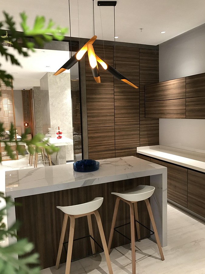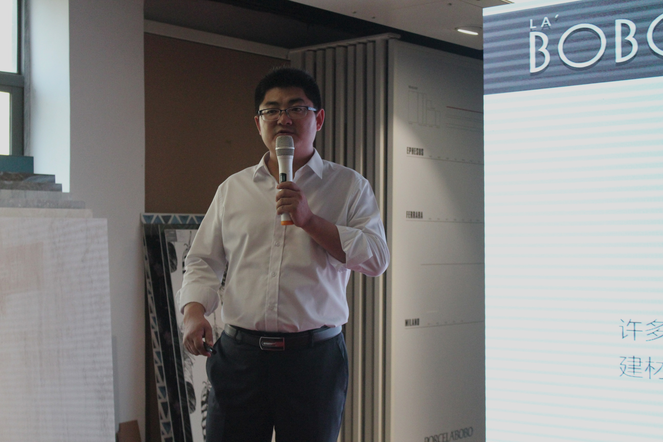 通過(guò)對(duì)BOBO CASA新展廳每一個(gè)應(yīng)用空間的全面解讀,肖濤詳細(xì)地跟大家介紹了LA’BOBO專(zhuān)業(yè)薄型無(wú)機(jī)飾面瓷板的用途及設(shè)計(jì)風(fēng)格。LA’BOBO陶瓷薄板從產(chǎn)品的品質(zhì)、設(shè)計(jì)及運(yùn)用、工藝美學(xué)等方面下功夫,提出薄型瓷質(zhì)無(wú)機(jī)飾面材料的定位,目標(biāo)就是不斷的取代皮革、墻紙等傳統(tǒng)飾面材料在空間上的運(yùn)用。新一代的LA’BOBO陶瓷薄板主要以仿石紋為主,并搭配高端木紋、經(jīng)典皮革及布紋組成。通過(guò)一石多面等效果,全面彰顯LA’BOBO陶瓷薄板對(duì)美學(xué)的理解及運(yùn)用。