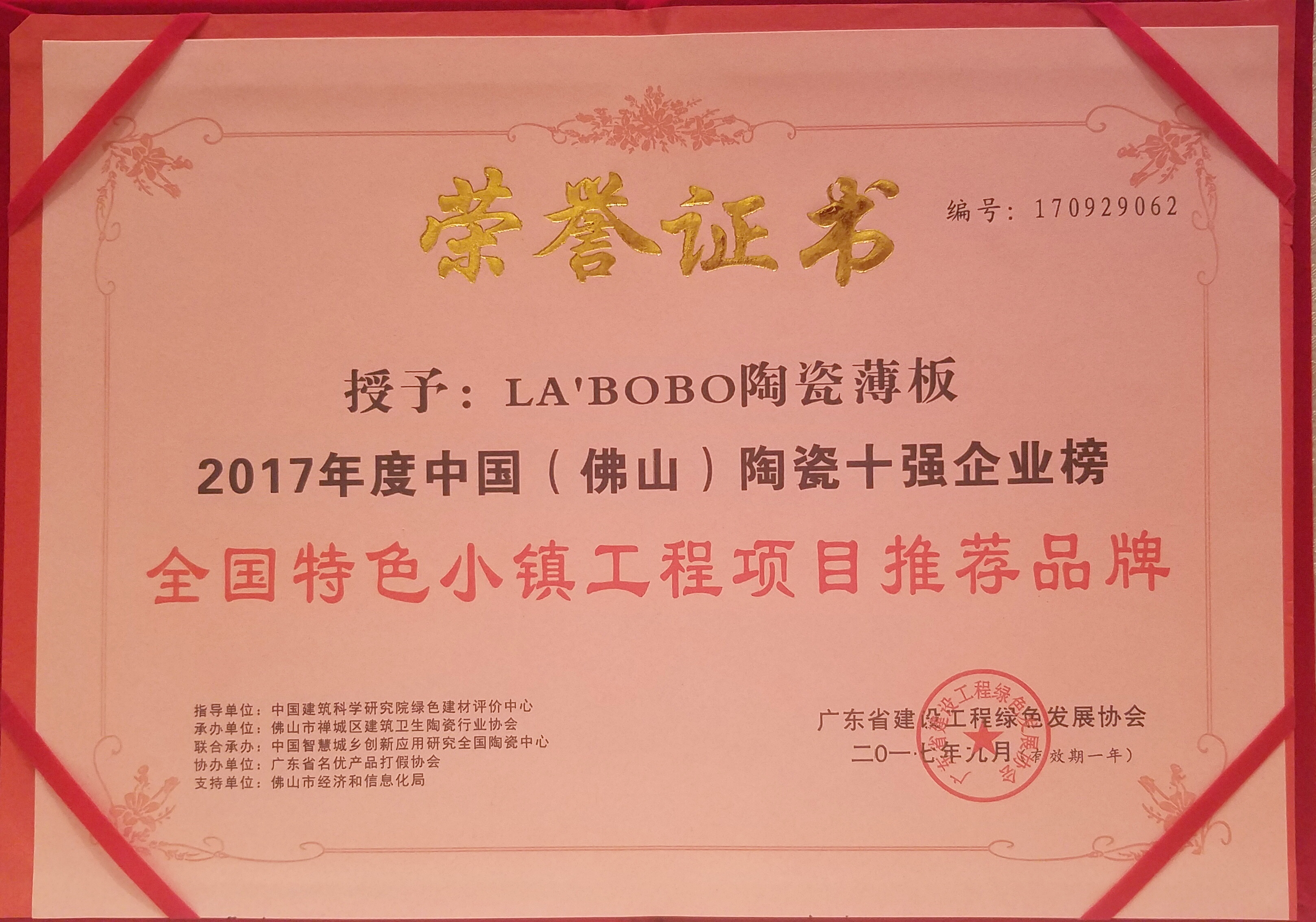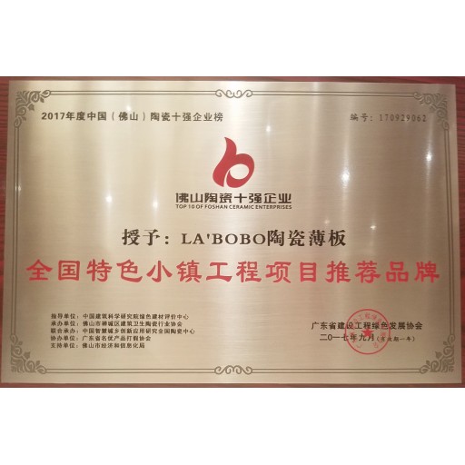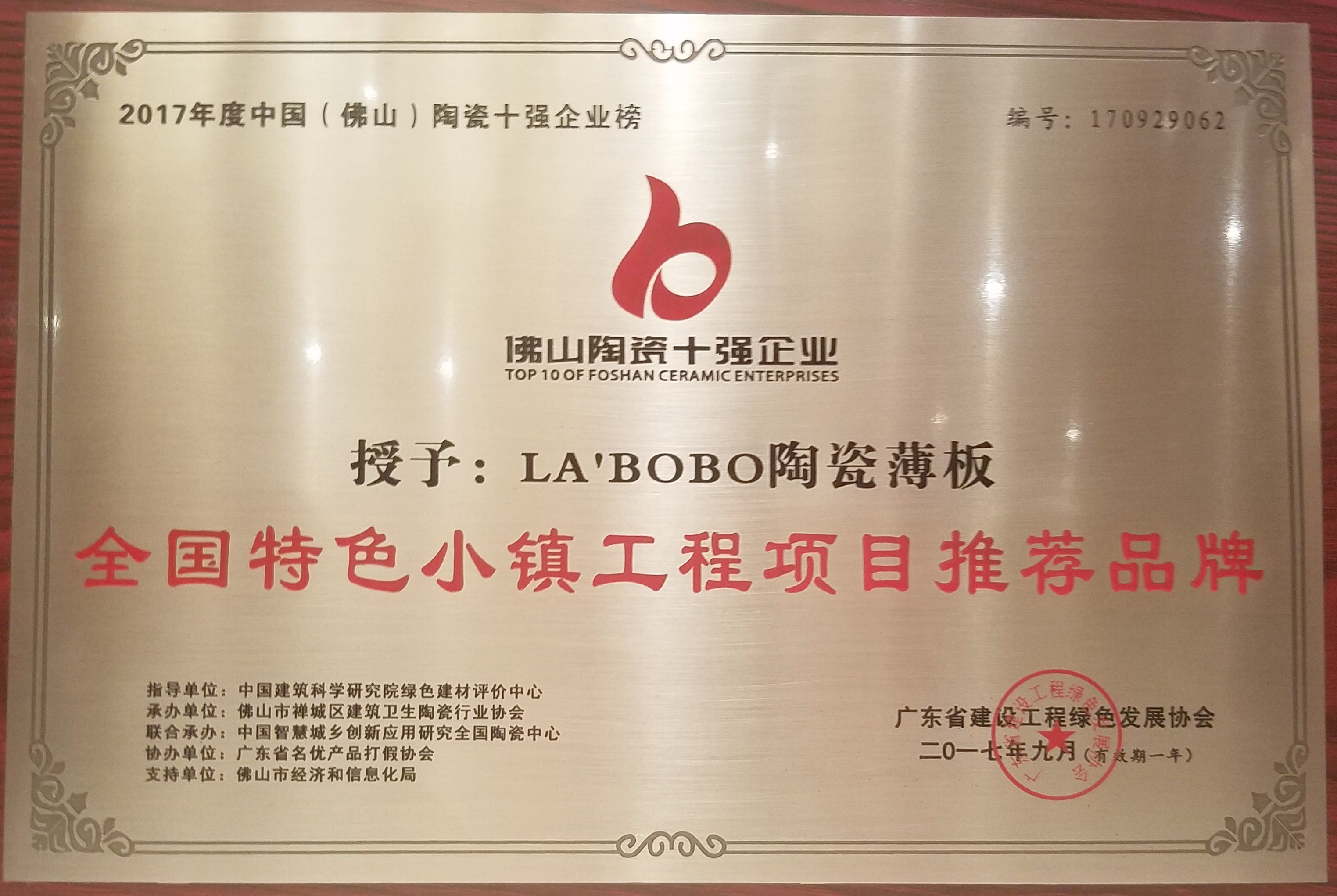 2017年9月29日,由廣東省建設工程綠色發(fā)展協(xié)會、佛山市禪城區(qū)建筑衛(wèi)生陶瓷行業(yè)協(xié)會、廣東省名優(yōu)產(chǎn)品打假協(xié)會等單位共同舉辦的“2017綠色建材與陶瓷(智能)發(fā)展大會暨‘佛山陶瓷十強企業(yè)’授牌儀式”在佛山嘉思高酒店隆重舉行。今年的大會主題是陶瓷創(chuàng)新及智能制造與綠色發(fā)展理念。LA’BOBO陶瓷薄板應邀出席了本次盛會,并在本次大會上榮獲“全國特色小鎮(zhèn)工程項目推薦品牌“獎牌與證書。