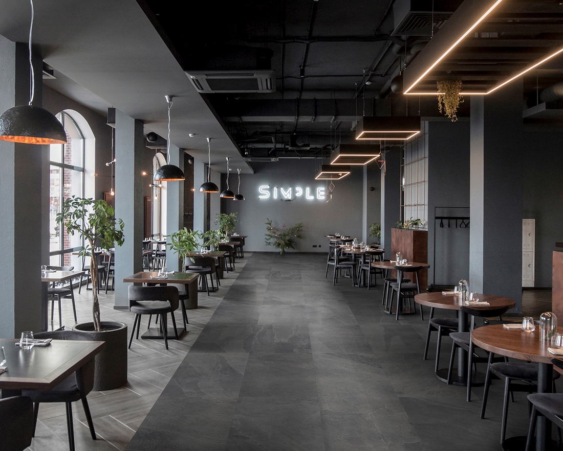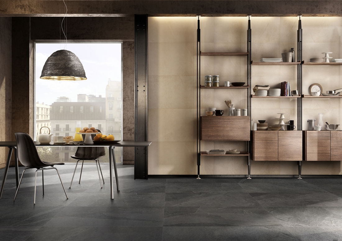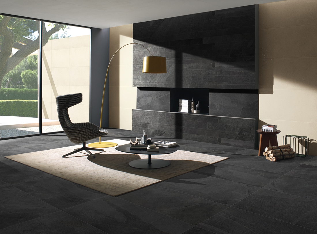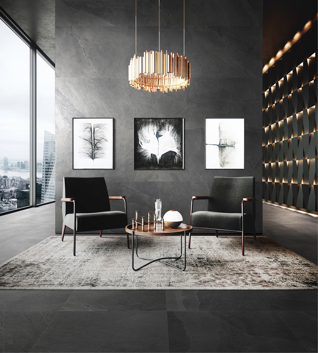 火山巖目前有深灰和炭黑兩個(gè)顏色,深色色系搭配質(zhì)面本身追求的粗糙自然,大面積使用更顯得格調(diào)高貴。并且,深色系的薄板無(wú)論應(yīng)用在家居空間,還是公共建筑空間,都會(huì)更加耐臟防污,大大減少清潔和維護(hù)的成本。